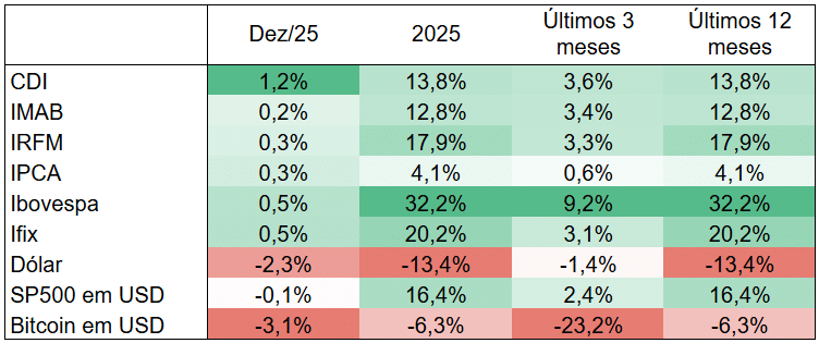 O cenário brasileiro permanece positivo para tomar risco, dado os grandes prêmios dos ativos, principalmente na renda fixa de médio prazo (3-10 anos). A taxa Selic deve cair ao longo de 2026. É preciso bastante atenção à disciplina fiscal dos próximos anos.
