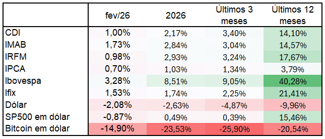 No mercado internacional os olhos estão voltados para o desenvolvimento e os grandes volumes de investimentos em IA. Além disso, a pauta da guerra EUA+Israel contra Irã tomou os holofotes e pressionou o preço do petróleo, o que pode ser um gatilho gerador de incerteza e inflação global. A diversificação entre classes e geografias é, cada vez mais, fundamental para garantir um bom retorno dos investimentos.
