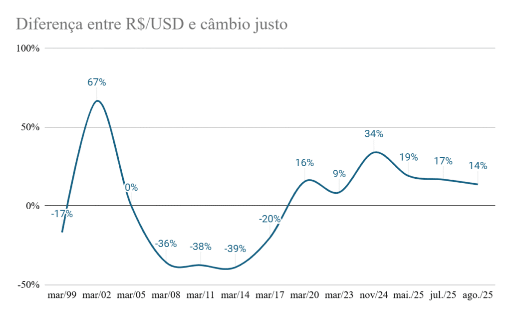 O carrego de juros real brasileiro permanece extremamente elevado, com o diferencial de juros entre Brasil e EUA ainda maior do que nos últimos meses. Esse fator é uma condição relevante que tende a valorizar o Real frente ao Dólar. Em Dez/24 o dólar chegou a R$6,30, e atualmente encontra-se em R$5,30, uma valorização de 16% em poucos meses.