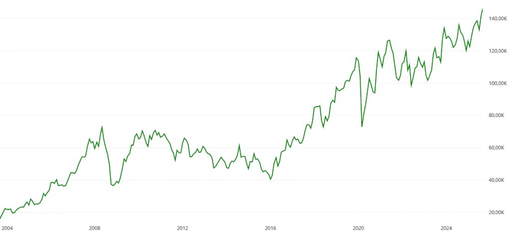 Apesar de o índice Ibovespa estar na sua máxima histórica, em 147 mil pontos, o seu topo corrigido pelo IPCA situa-se ao redor de 175 mil pontos. Ou seja, em termos reais ainda estamos longe do topo.