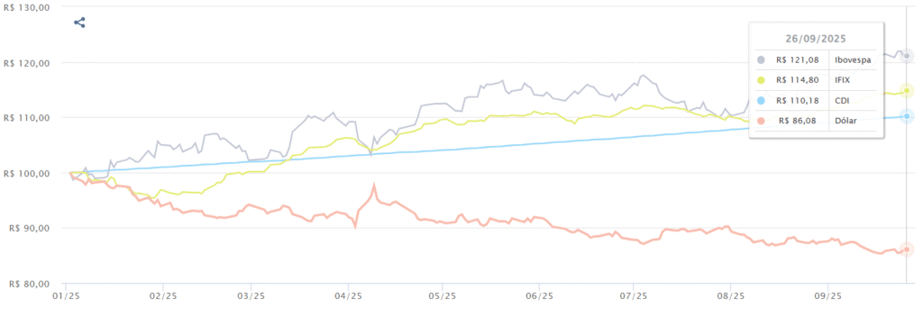 Ao analisar o comportamento dos principais ativos domésticos em 2025 podemos perceber que tanto o Ibovespa quanto o Ifix estão com um ótimo desempenho no ano, mesmo frente a um CDI de 15%. O dólar, por sua vez, já está caindo 14% no acumulado de 2025.