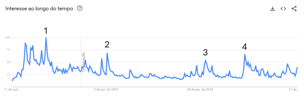 O Google Trends é uma ferramenta muito interessante. Permite analisarmos qual o interesse de busca de determinado assunto em uma região específica do globo em uma determinada janela temporal. Basta acessar trends.google.com e podemos saber quais são os assuntos mais buscados do mundo no Google. Além disso, é possível ver o histórico: podemos saber quando foi o pico de buscas de determinado assunto.